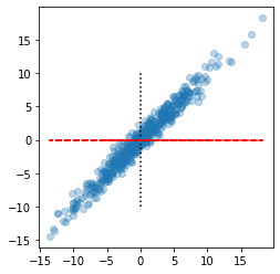 import numpy as np import matplotlib.pyplot as plt from sklearn.datasets import make_blobs data,label=make_blobs(n_samples=500,centers=[[0,0]]) data plt.hlines([0],-10,10,linestyles=':') plt.vlines(..