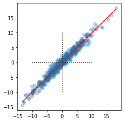 y=X+np.random.randn(500) # 곱하는 수에 따라 회전(기울기 개념)