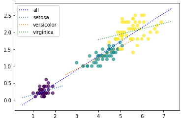 sklearn.linear regression.꽃종류 별 회귀 선 그리기 본문