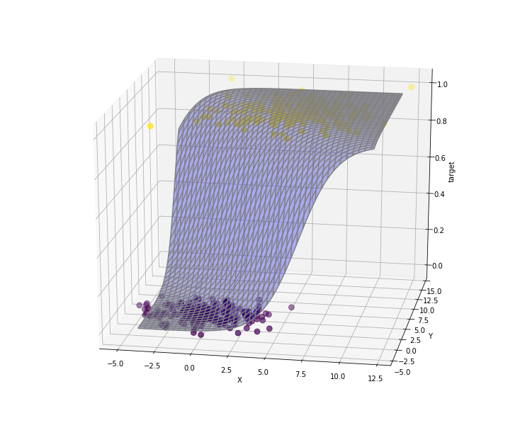 ax.plot_surface(xx, yy, sigmoid(model.coef_[0,0]*xx + model.coef_[0,1]*yy + model.intercept_[0]),