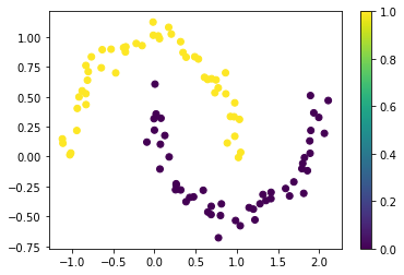 from sklearn.datasets import make_moons X,y=make_moons(noise=0.1) plt.scatter(X[:,0],X[:,1],c=y)