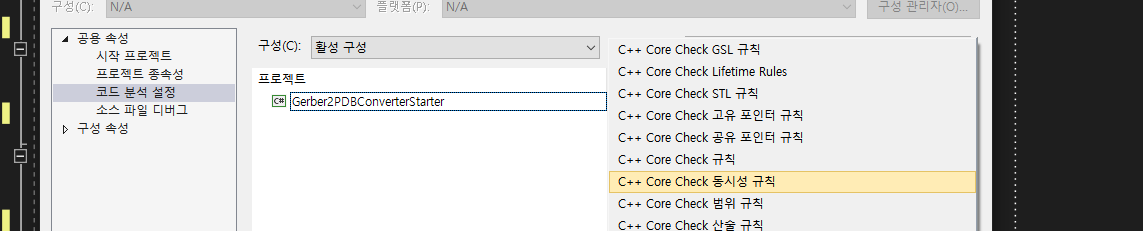 Project 파일(.csproj)을 메모장에서 열어, PropertyGroup에 아래를 추가 하면, ruleset 파일을 적용할 수 있다.