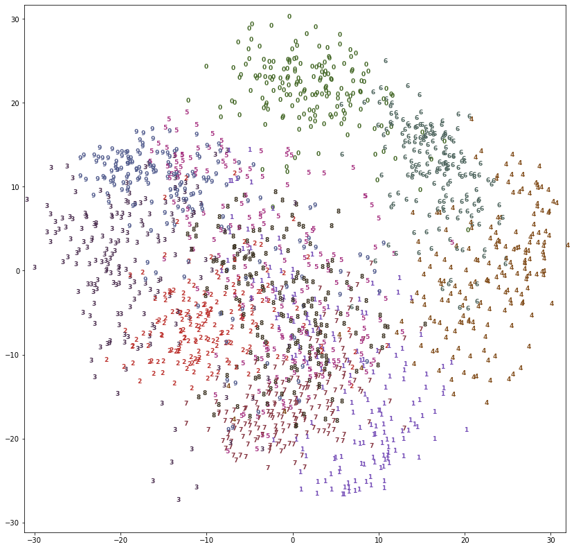 plt.text(X_pca[i,0],X_pca[i,1],str(mnist.target[i]),color=colors[mnist.target[i]],fontdict={'weight':'bold','size':9})