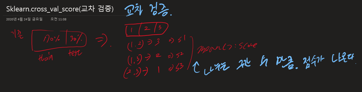 scores=cross_val_score(model,iris.data,iris.target,cv=3)# cv =3(조각 수) default : 3