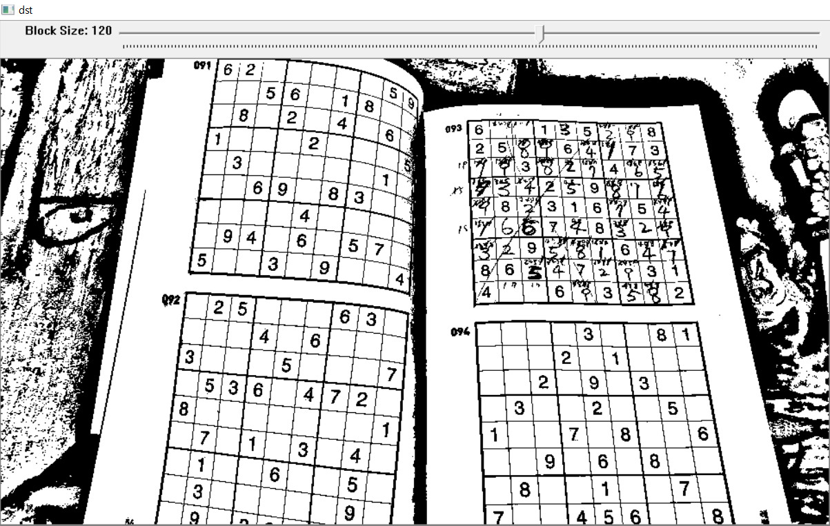 adaptiveThreshold(src, dst, 255, ADAPTIVE_THRESH_GAUSSIAN_C, THRESH_BINARY, bsize, 5);