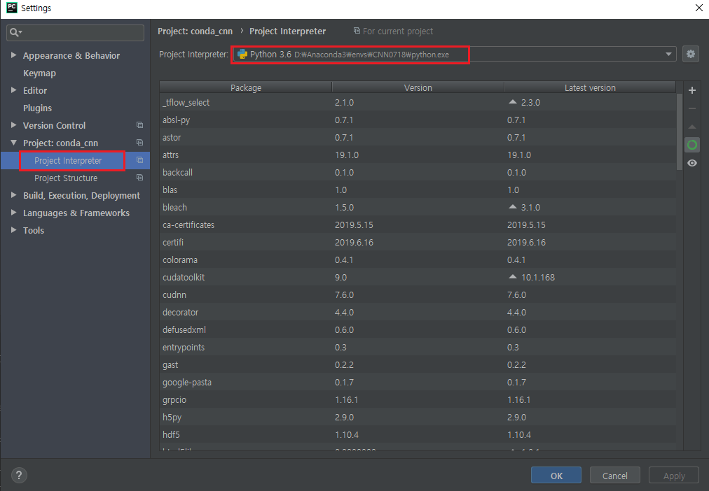 >파이참 실행 > interpreter설정 > 아나콘다 가상환경 선택