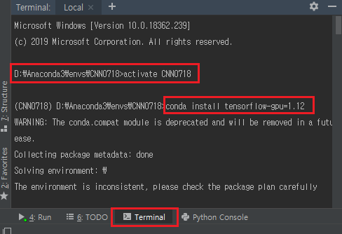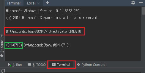 >파이참 terminal탭에서 해당 가상환경 진입>activae 가상환경이름