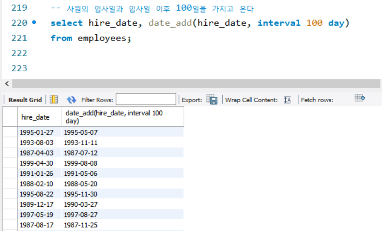 | date add(날짜, interval 기준값) | 날짜에서 기준값 만큼 더함 (year, month, day, hour, minute, second) |