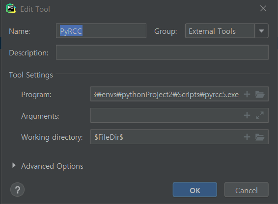 Program : <pyrcc5.exe with it's path>