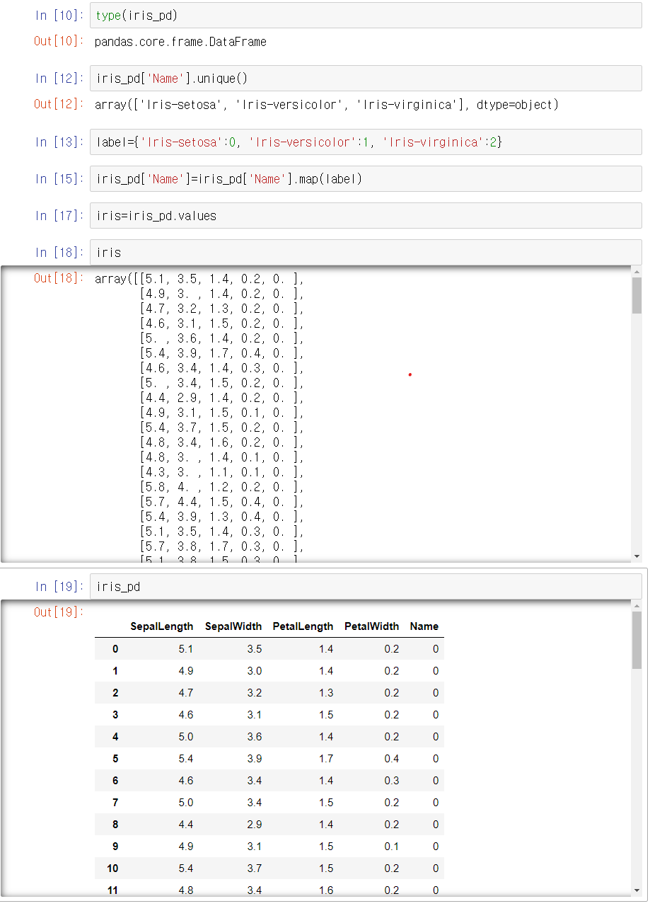 iris=iris_df.values #Pandas 데이터 모두를 Numpy 데이터 형태로 가져온다
