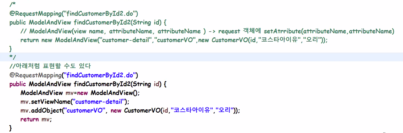 return new ModelAndView("customer-detail", "customerVO", new CustomerVO(id, "코스타아이유", "오리"));
