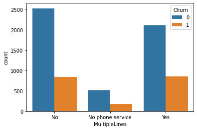 Countplot : sns.countplot(data=df, x=’MultipleLines’, hue=’Churn’)