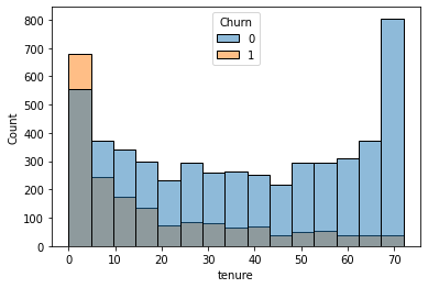 sns.histplot(data=df, x=’tenure’, hue=’Churn’)