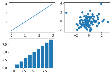 axes[0,0].plot([1,2,3,4]) import numpy as np import matplotlib.pyplot as plt axes[0,0].plot([1,2,3,4]) axes[0,1].scatter(np.random.randn(100),np.random.randn(100)) axes[1,0].bar(range(10),range(10..