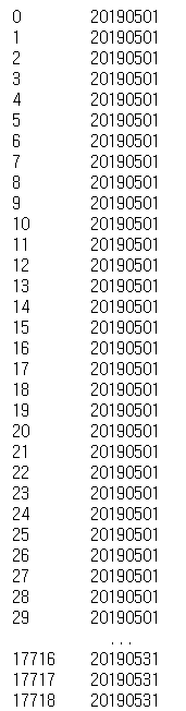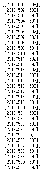 [[day, data[data.사용일자==day].shape[0]] for day in range(20190501,20190532)]