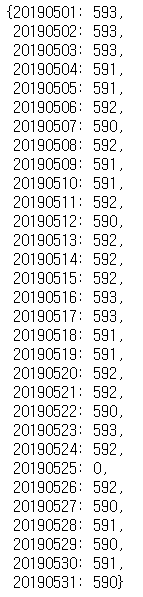 {day: data[data.사용일자==day].shape[0] for day in range(20190501,20190532)}